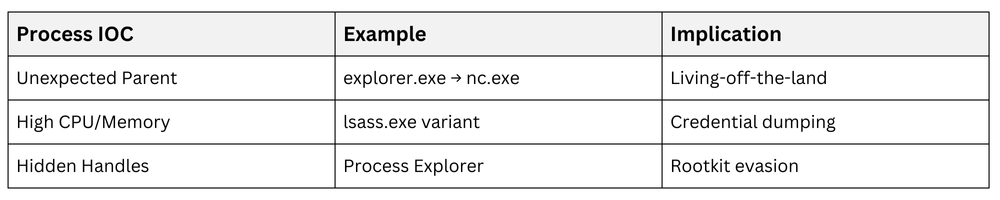 Parent-child mismatches (svchost.exe spawning cmd.exe) suggest injection. Orphaned processes (no parent) or high-privilege unexpected binaries indicate escalation. Services with recent creation dates (sc query) often serve C2.