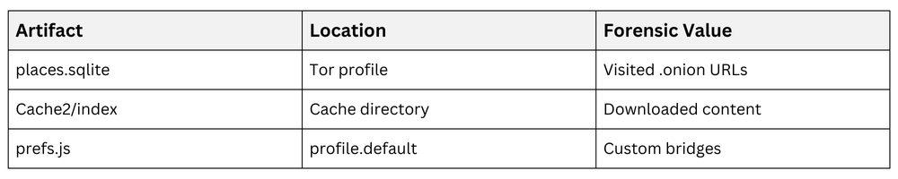 WebCacheV2.dat holds thumbnails; sessionstore.js snapshots tabs. Tor-specific: State directory (/var/lib/tor) logs hidden service descriptors. Downloads folder timestamps files from markets.