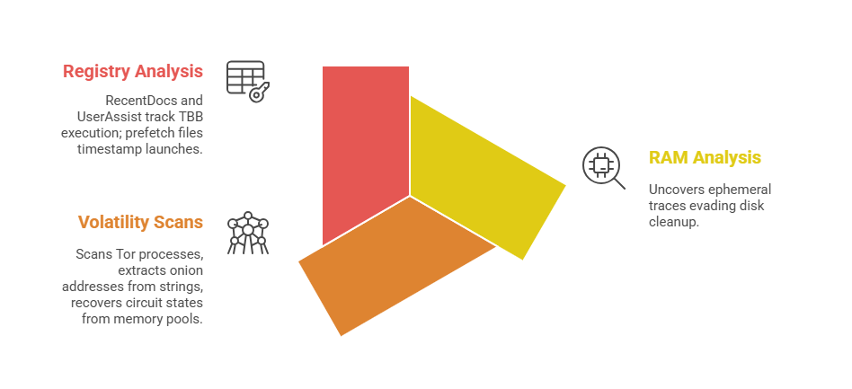 Investigators examine browser caches, memory residues, configuration files, and endpoint logs to prove access to .onion sites or hidden services, despite design goals of anonymity.