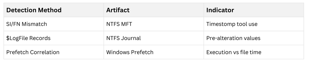 NTFS $MFT $Standard_Information (SI) and $File_Name (FN) timestamps mismatch indicates forgery; $LogFile records prior values. USN Journal tracks changes; prefetch files and event logs provide external validation.