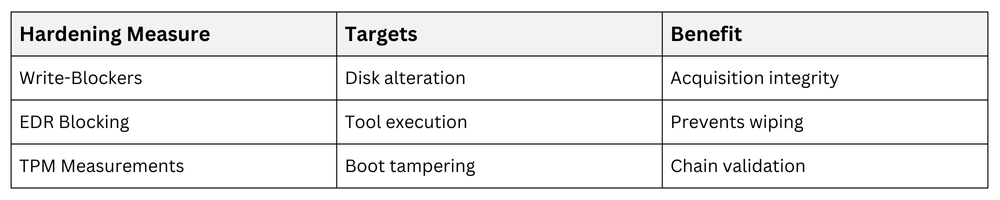 Write-blockers mandatory for imaging; TPM-sealed boot verifies tampering-free acquisition. EDR blocks anti-forensic tools (sdelete, timestomp); immutable firmware logs survive OS reinstalls.