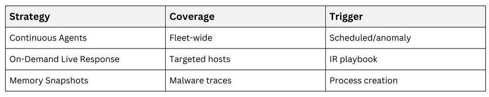 Agents like Velociraptor deploy across fleets, capturing RAM dumps, process lists, and network states on alert. Scheduled collections baseline normalcy; EDR platforms (CrowdStrike, SentinelOne) snapshot on anomaly.