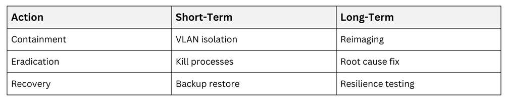 Short-term containment: Network ACLs, endpoint isolation. Eradication: Malware removal, credential rotation, patch deployment. Recovery: Phased restoration from verified backups; validate with scans.