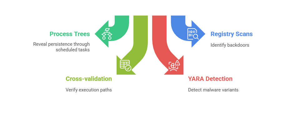 Timelines reveal spread vectors (RDP pivots); memory scans confirm active malware. Partial containment (VLANs) allows monitoring; full isolation follows eradication proof.