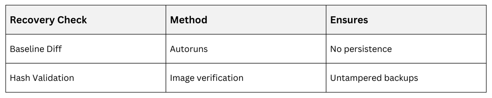 Restoration verifies clean state forensically. Baseline comparisons post-restore; integrity checks on backups. Re-imaging from verified gold images; monitor for reemergence via EDR.