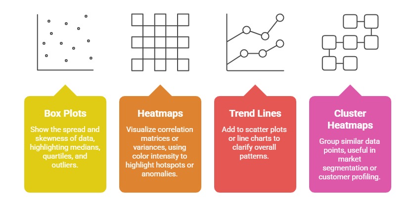 These techniques allow users to quickly detect outliers, clusters, and trends that inform decision-making.