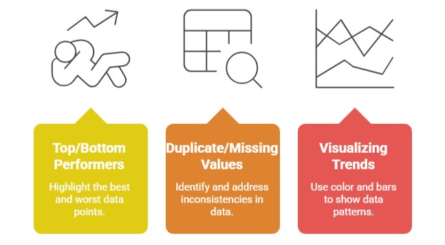 Conditional formatting applies visual cues such as colors or icons to highlight data patterns, anomalies, or key metrics quickly: