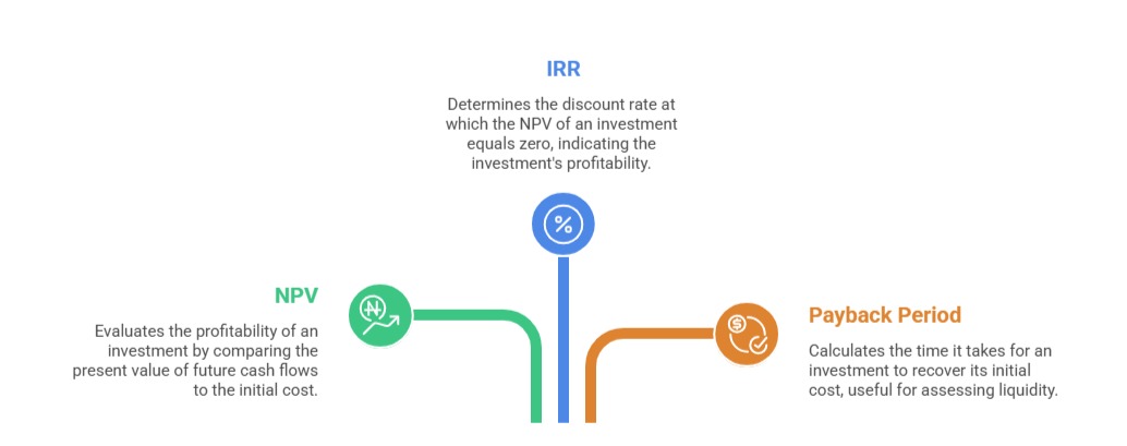Using methods such as Net Present Value (NPV), Internal Rate of Return (IRR), and the Payback Period, organizations estimate future cash flows, discount them to present value, and compare these values against initial costs to assess profitability.