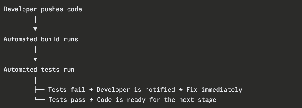 Developers merge their code changes into a shared repository frequently — at least once a day. Every merge automatically triggers a build and runs a set of automated tests. If something breaks, the team knows immediately.