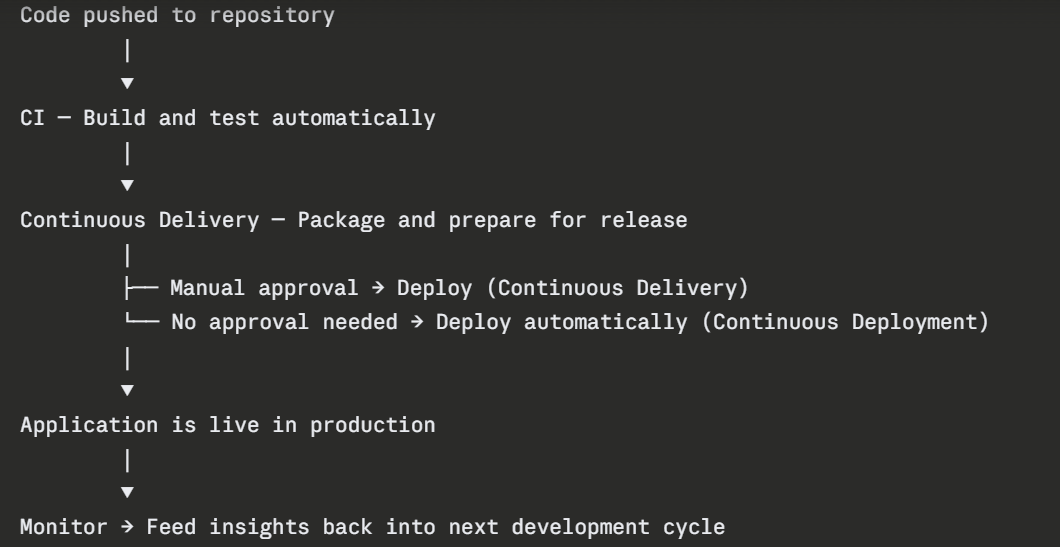 Continuous Deployment goes one step further than Continuous Delivery. Every change that passes all automated tests is deployed to production automatically — no human approval needed.
