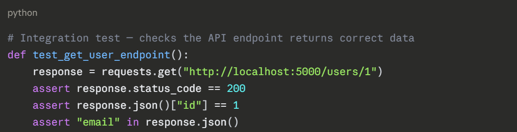 Integration tests check that different parts of the system work correctly together — your application connecting to a database, an API calling another service, a Lambda function writing to S3.