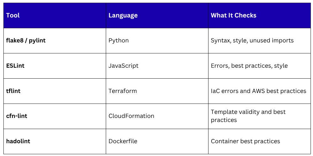 Linting is automated code quality checking. A linter reads your code and flags problems — syntax errors, formatting issues, unused variables, overly complex functions, security anti-patterns — before the code even runs.