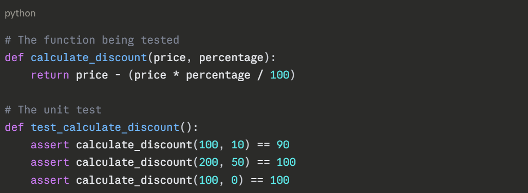 Unit tests check individual pieces of code in isolation — a single function, a single method, a single class. They are fast, focused, and tell you exactly which part of the code is broken.