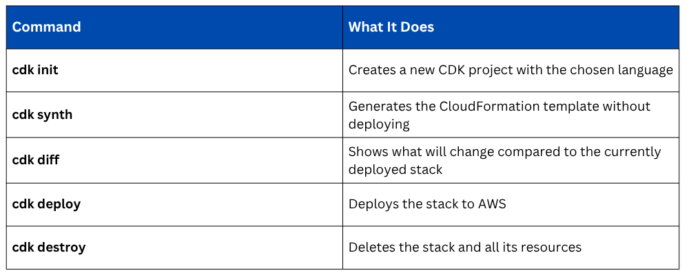 cdk diff is particularly useful — it is CDK's equivalent of a change set preview. Always run it before deploying to production.