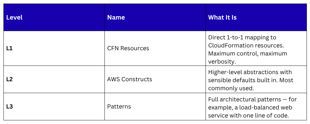 3. Constructs: Constructs are the building blocks of CDK. Every resource you define is a construct. CDK has three levels of constructs: