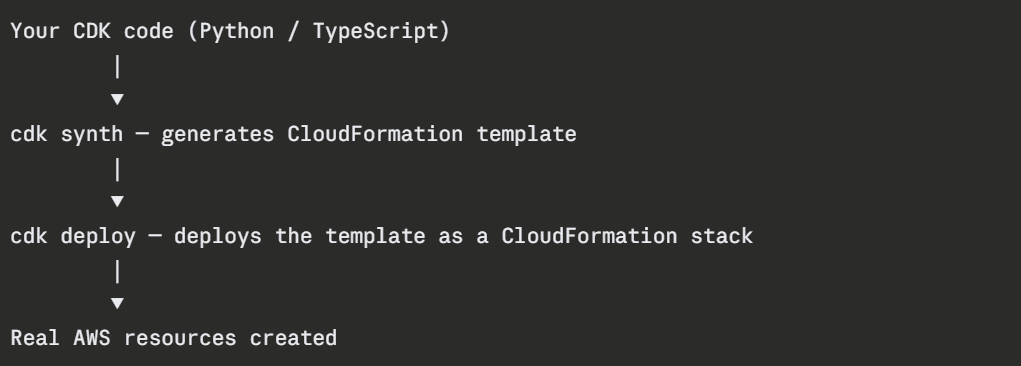 CDK sits on top of CloudFormation. You write infrastructure code in your preferred language, and CDK compiles it into a CloudFormation template and deploys it as a CloudFormation stack.