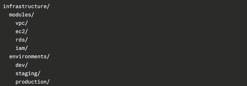 Each module handles one responsibility. The environment folders reference those modules and pass in environment-specific values — different instance sizes, different database configurations, different scaling settings.