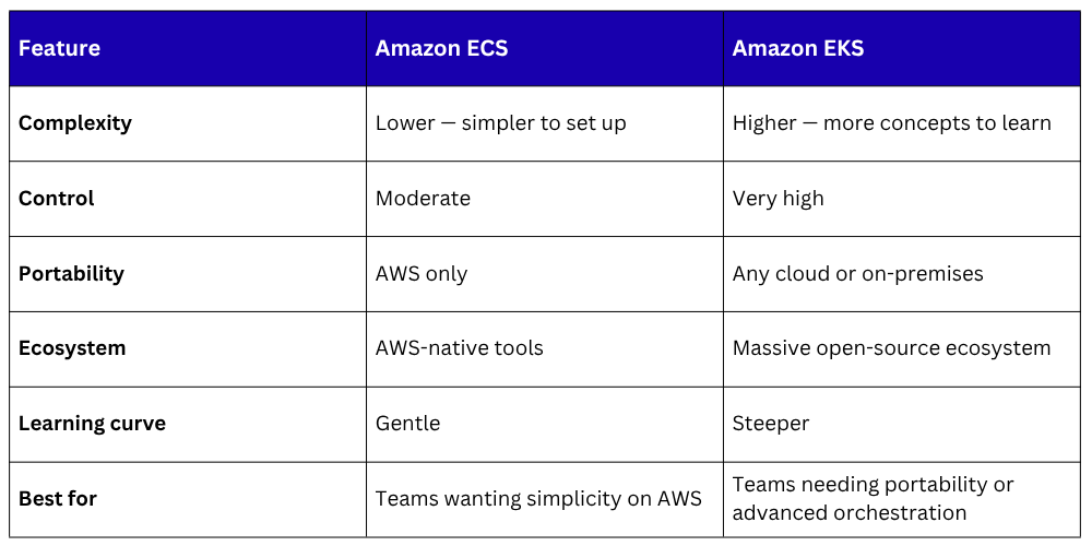 If your organisation runs multi-cloud, needs advanced networking or scheduling control, or has teams already experienced with Kubernetes, EKS is the right choice.