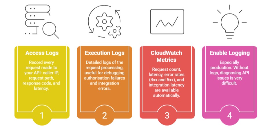 API Gateway integrates with CloudWatch for logging and monitoring:
