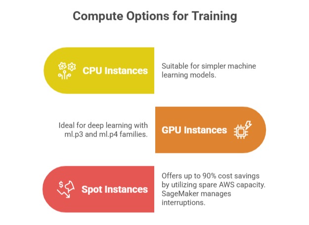 3. Bring Your Own Script: For custom models, you write a training script in Python using frameworks like TensorFlow, PyTorch, or scikit-learn. SageMaker wraps it in a managed container and runs it on your chosen compute.