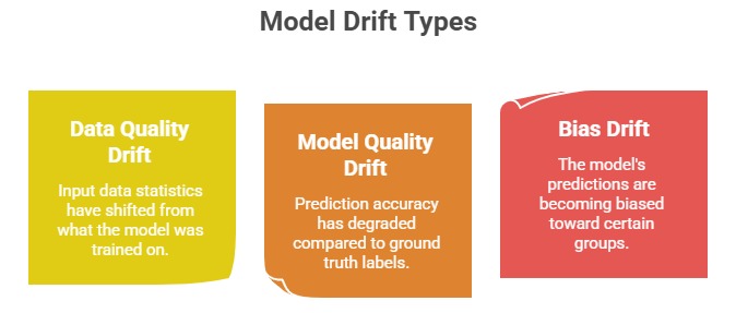 Once deployed, a model needs continuous monitoring. SageMaker Model Monitor automatically captures inference data — the inputs sent to the model and the predictions it returns, and compares them against a baseline established from training data.