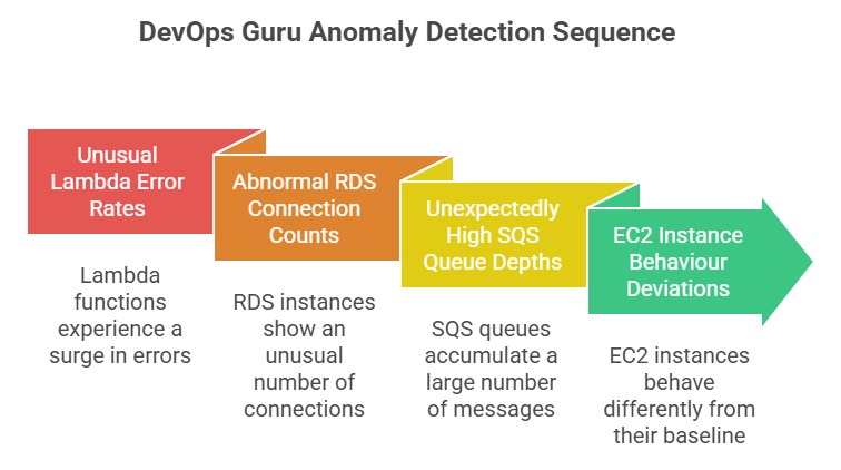 DevOps Guru is an AWS service purpose-built for operational anomaly detection. It continuously analyses your AWS resources — CloudWatch metrics, CloudTrail events, Config changes — and uses ML to identify operational issues before they cause downtime.