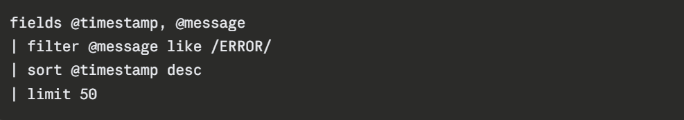 This returns the 50 most recent error messages sorted by time — what would take minutes of manual scrolling takes seconds with Logs Insights.