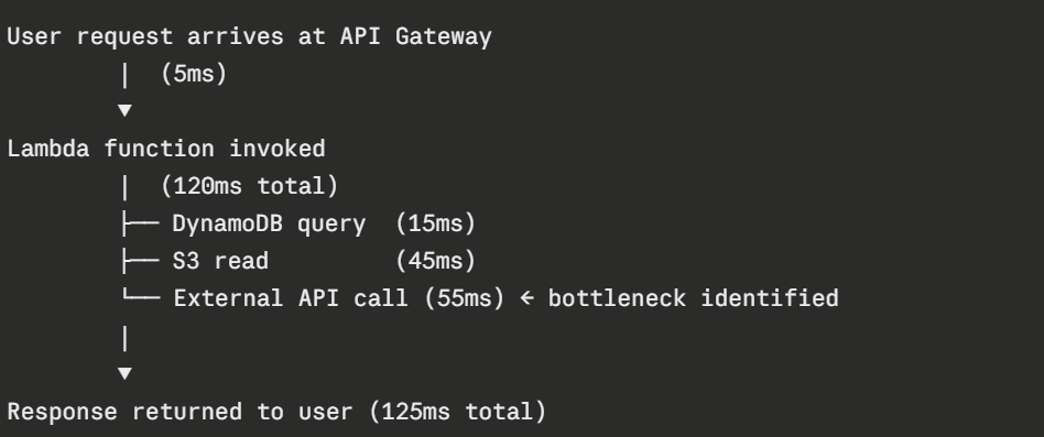 But in a distributed system, where a single user request touches multiple Lambda functions, APIs, databases, and services, neither metrics nor logs alone can show you the full journey of that request.