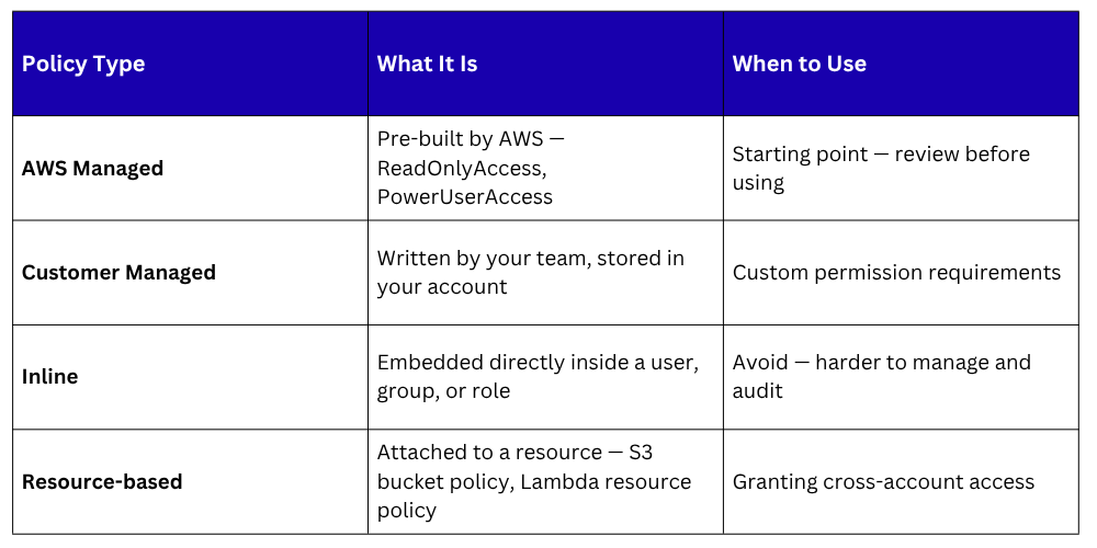 3. Roles: Temporary identities assumed by AWS services, applications, or users from other accounts. Roles are the correct mechanism for giving AWS services permission to interact with other services, a Lambda function reading from S3, an EC2 instance writing to CloudWatch, a CodeBuild job deploying to ECS.