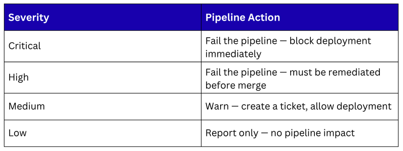 Not every vulnerability should fail the pipeline. Severity thresholds define which findings block deployment and which are reported but allowed through.