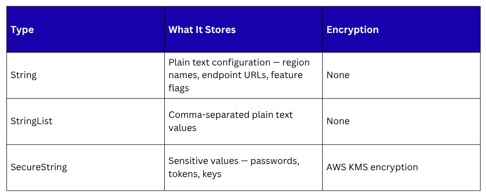 SecureString parameters are encrypted at rest using AWS KMS. Decryption happens automatically when your application retrieves the parameter with the WithDecryption flag — assuming the IAM role has permission to use the KMS key.