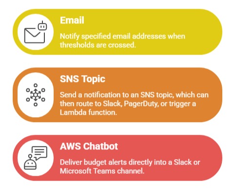 1. Cost Budget: Set a maximum dollar amount for your total AWS spend, spend for a specific service, or spend for a tagged subset of resources. Receive alerts at defined thresholds — for example, alert at 50%, 80%, and 100% of the budget.