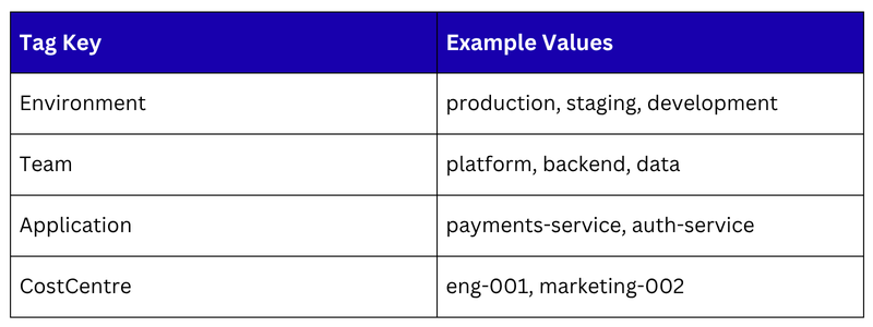 Without tags, Cost Explorer shows you total spend but cannot tell you which team, application, or environment that spend belongs to. A consistent tagging strategy is essential.