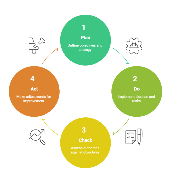 Understanding the PDCA methodology helps organizations plan strategically, execute efficiently, and improve continuously. Below are the main stages that define this cycle.
