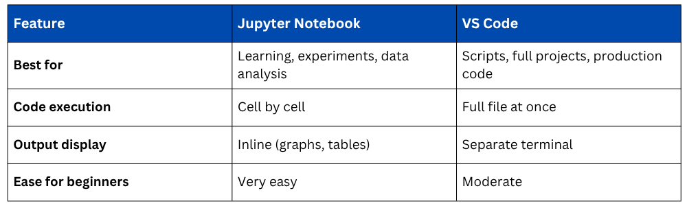 Recommendation: Use Jupyter Notebook while learning and experimenting. Switch to VS Code when you start building complete projects or working with multiple files.