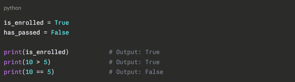 Booleans store one of two values only — True or False. They are the backbone of decision-making in code and are used extensively in conditions and comparisons.