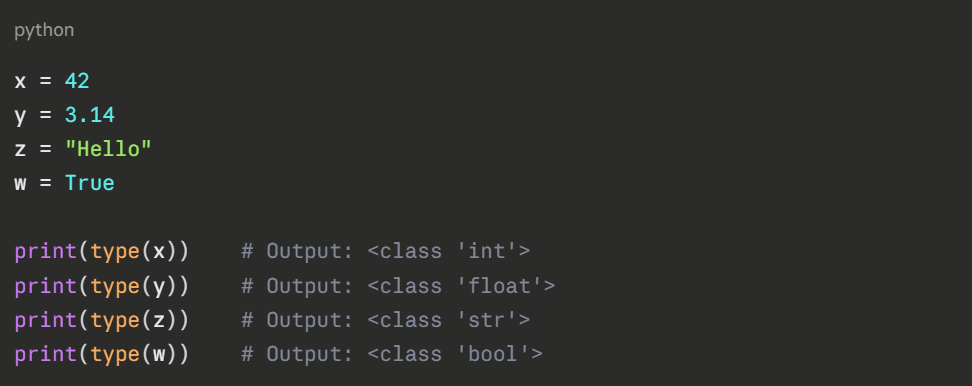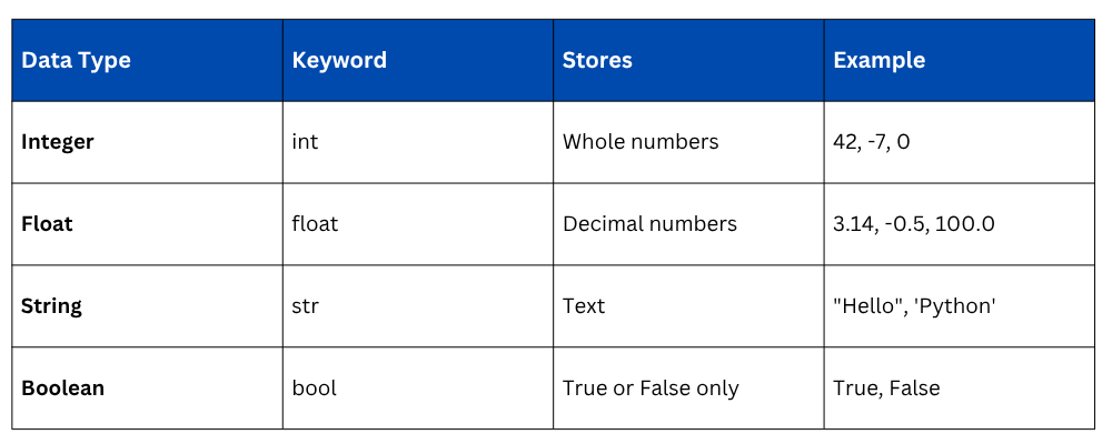 Python automatically identifies the data type of a variable based on the value you assign. You do not need to declare the type manually. The four essential types are: