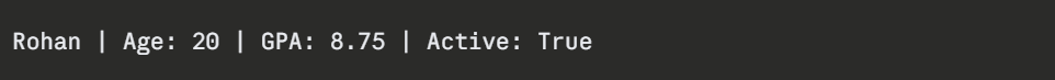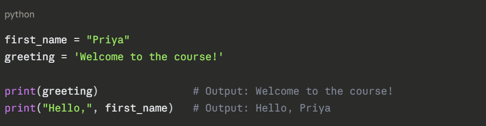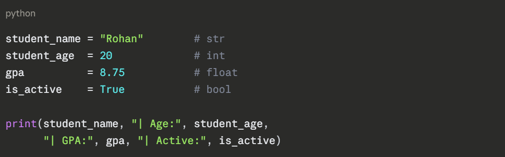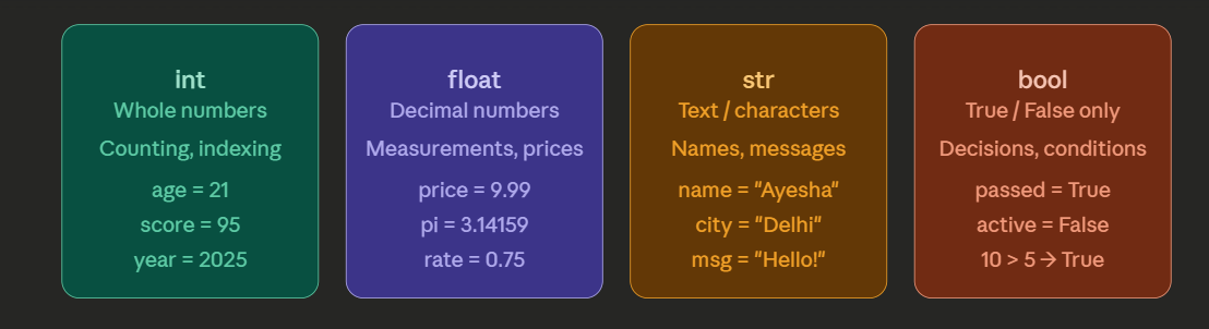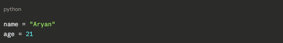 Here, name holds the text "Aryan" and age holds the number 21. Whenever you use name or age later in your program, Python retrieves the stored value automatically.