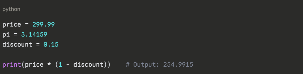 Floats represent numbers with a decimal point. They are used in calculations involving measurements, percentages, averages, and most real-world numerical data.