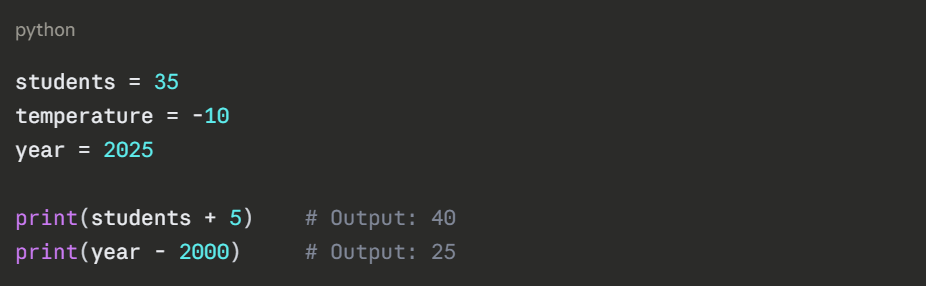 Integers are whole numbers — positive, negative, or zero. They are used for counting, indexing, and any calculation that does not involve decimals.