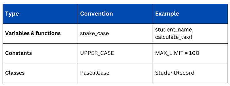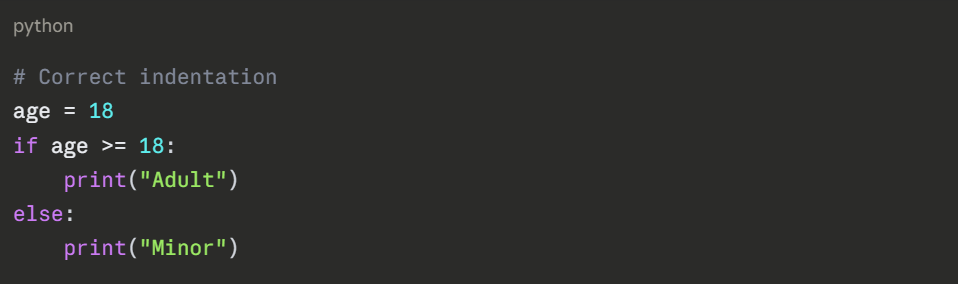 Python uses indentation to define code blocks. Consistent indentation — 4 spaces per level is both a Python rule and a readability best practice.