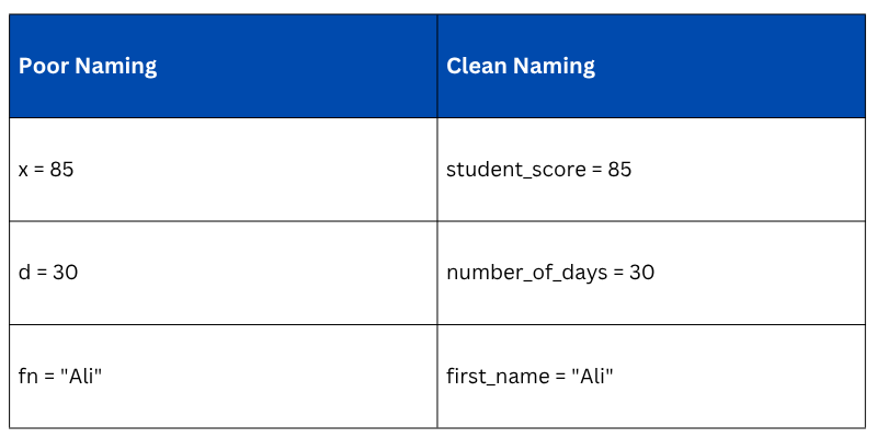 Variable names should clearly describe what they store. Avoid single letters or vague names unless used in short loops.