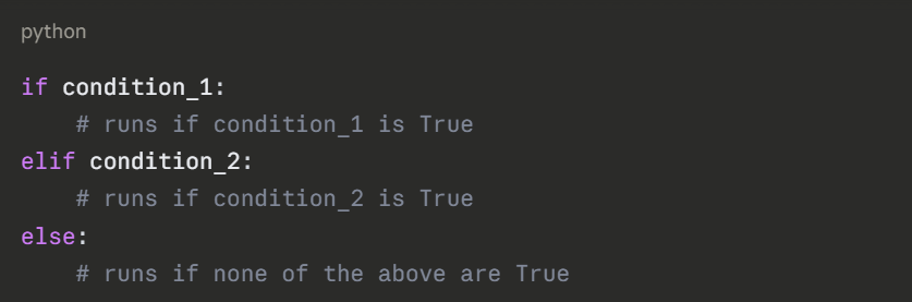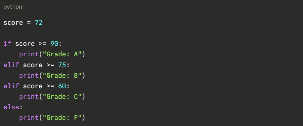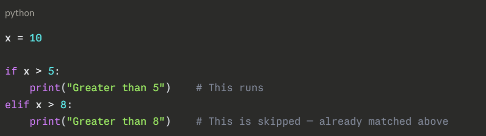 elif stands for else if. It allows you to check multiple conditions in sequence. Python evaluates each condition from top to bottom and executes the first one that is True.