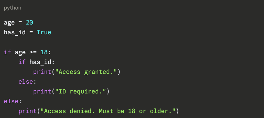 You can place an if statement inside another if block. This is called nesting, and it is useful when a decision depends on multiple layers of conditions.