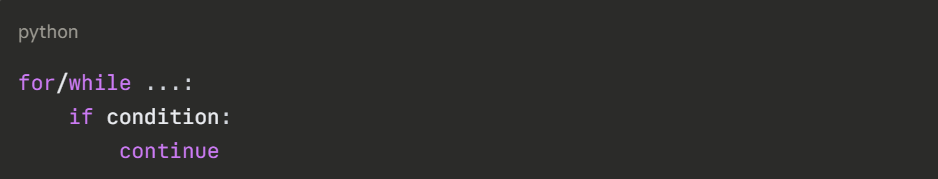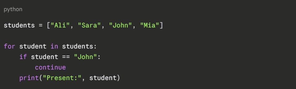 The continue statement skips the rest of the current iteration and jumps directly to the next one. Unlike break, it does not stop the loop — it just moves past the current cycle.