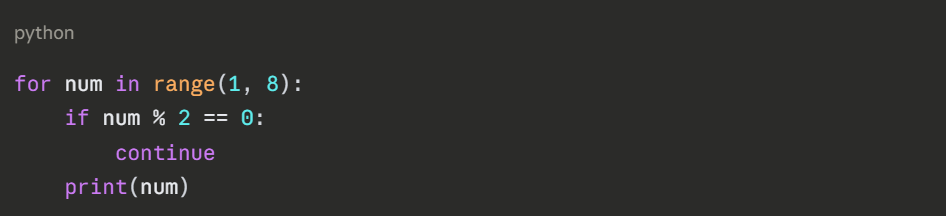 Even numbers are skipped; the loop continues with the remaining values.
