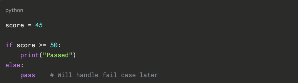 pass is commonly used during development when you are building the structure of your code before filling in the logic.