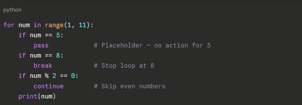 Python provides three loop control statements — break, continue, and pass that give you precise control over loop execution. They are simple to use but make a significant difference in writing efficient and logical code.