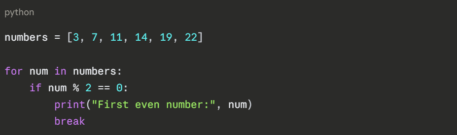 Problem: Search through a list of numbers and stop as soon as the first even number is found.