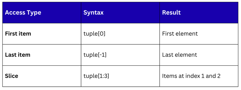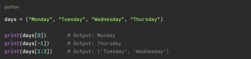 Tuples use the same indexing and slicing rules as lists — zero-based positive indexing and negative indexing from the end.